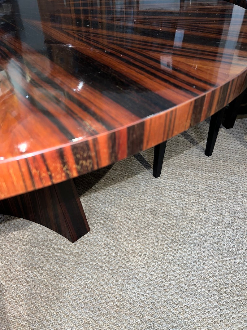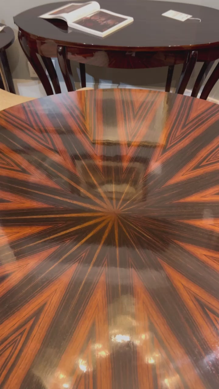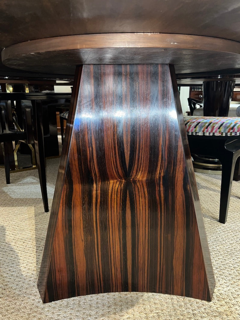 Beautiful Art Deco Dining Room circle table done with inlaid Macassar wood. Wide table top displays gorgeous wood grain. Top is supported by the prominent stable base.