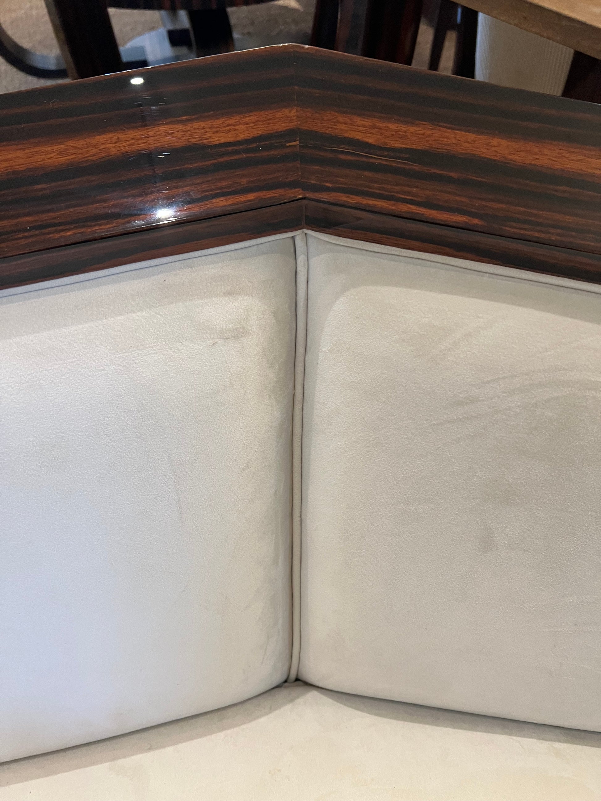 The sofa is made out of walnut wood, re-upholstered with a light color velvety fabric. Resting on elongated rectangular legs.