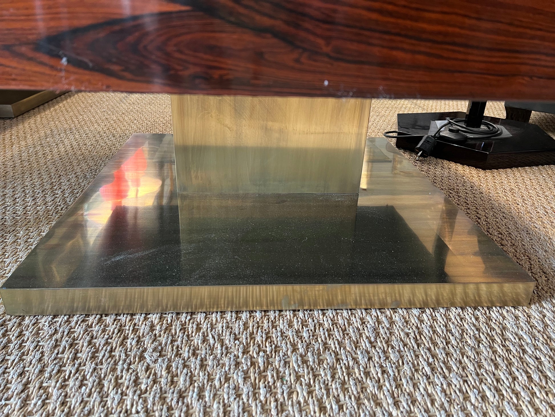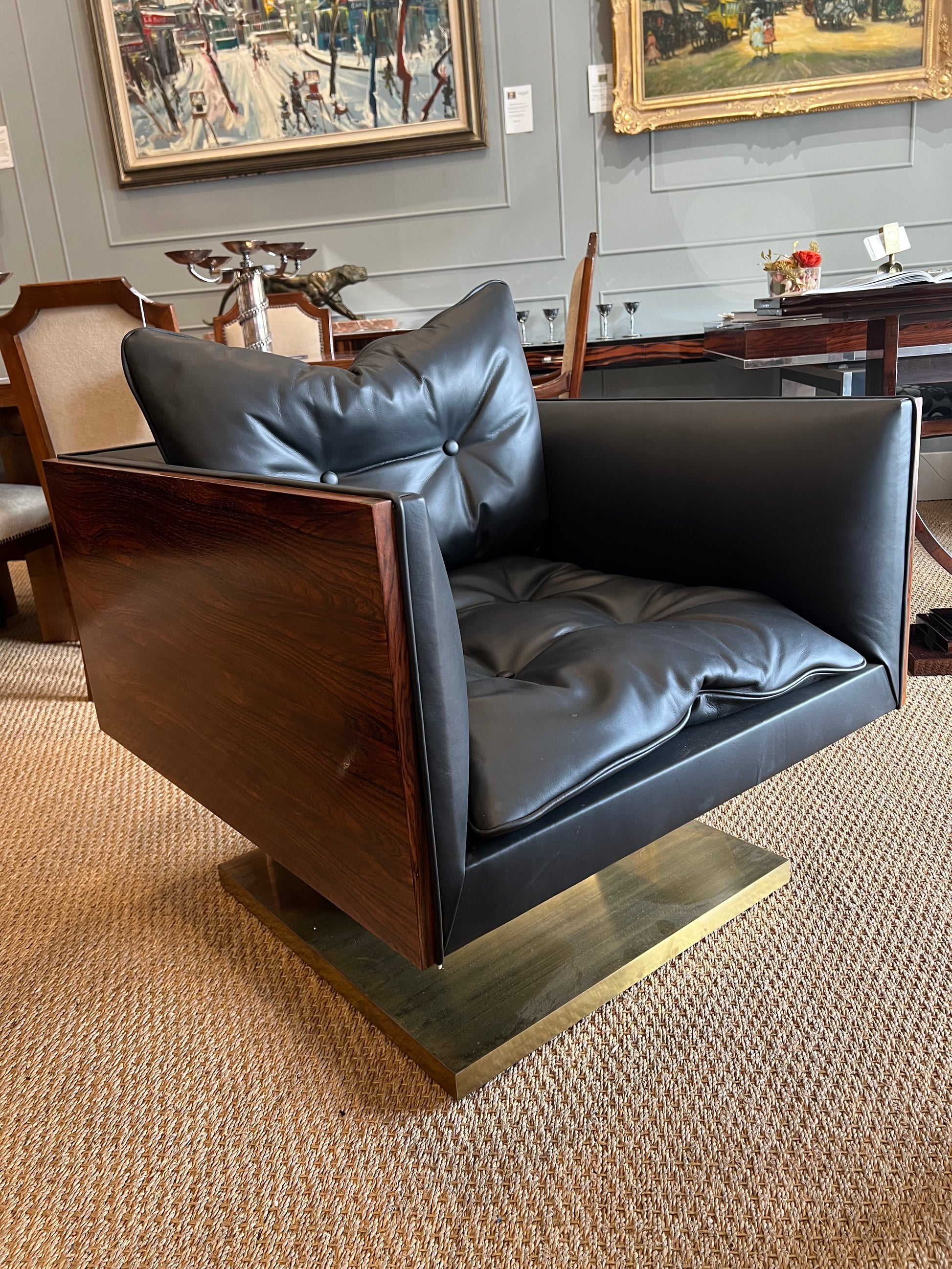 The chair is made out of zebra wood. Upholstered with black cowhide. Brass-plated base.