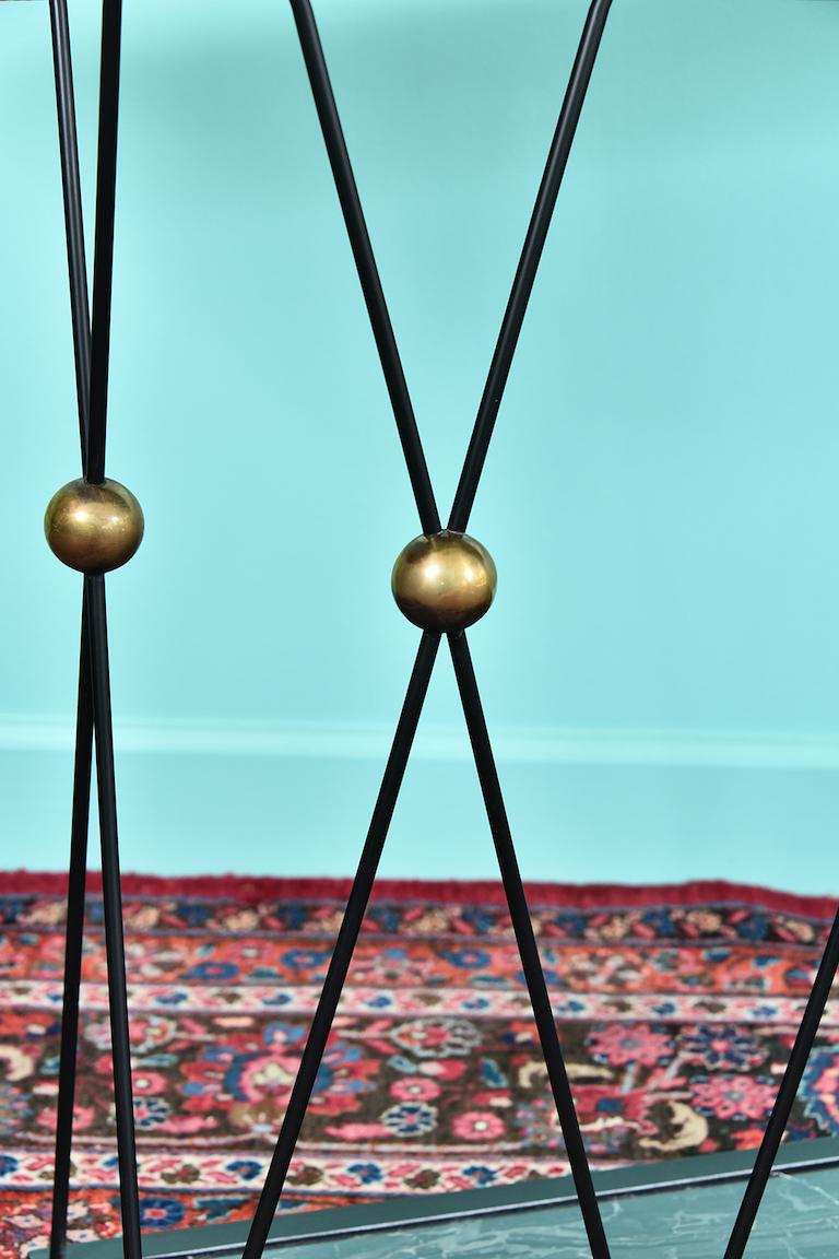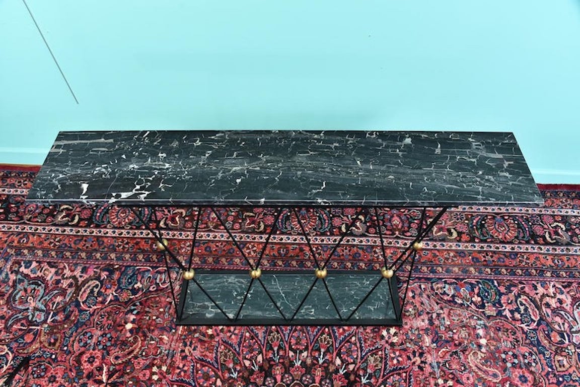 Top and the bottom of the console are made out of marble, supporting elements are made out of wrought iron and brass.