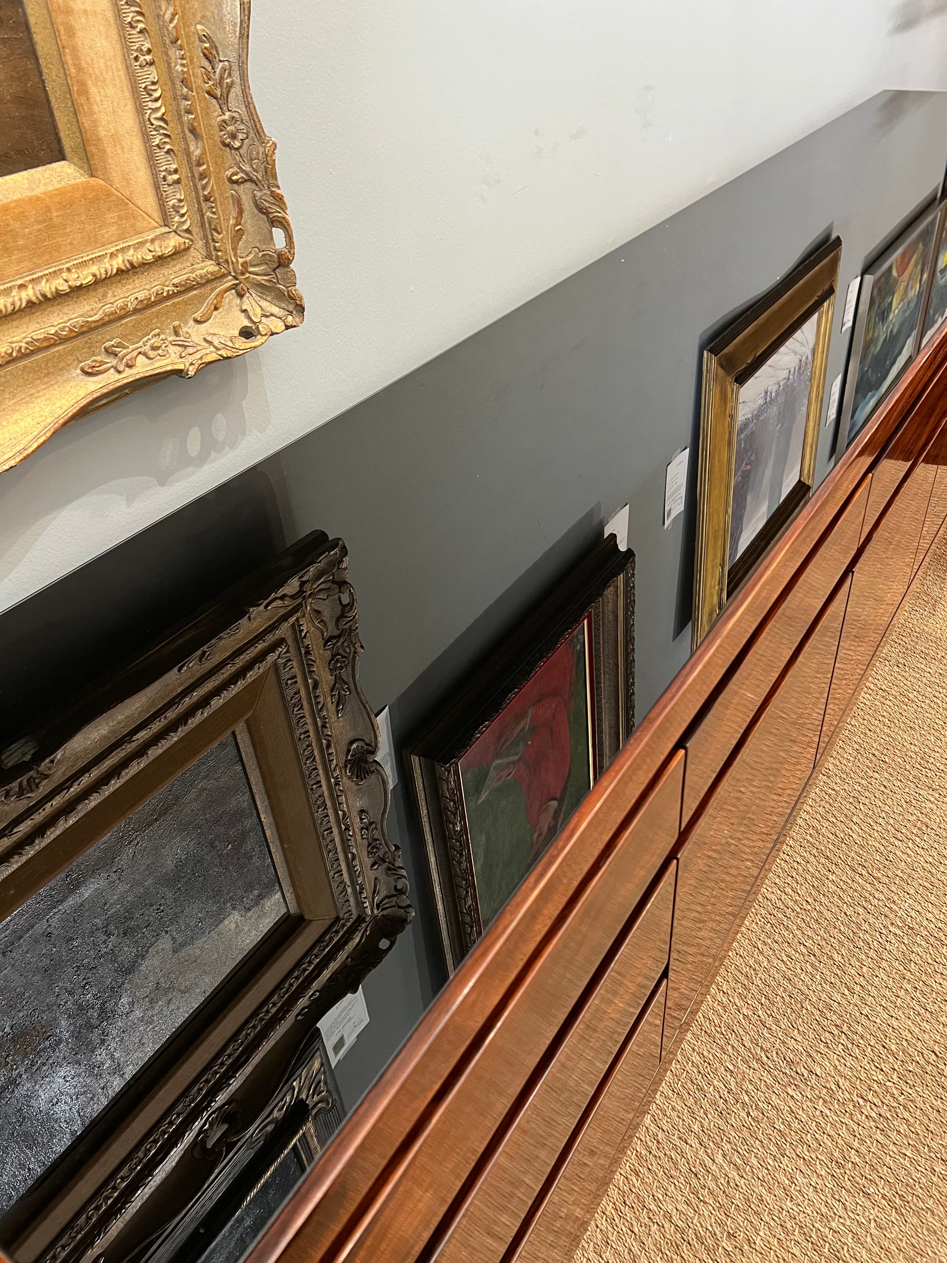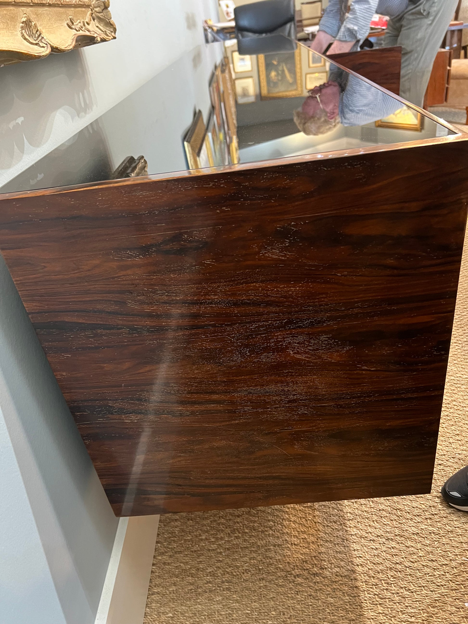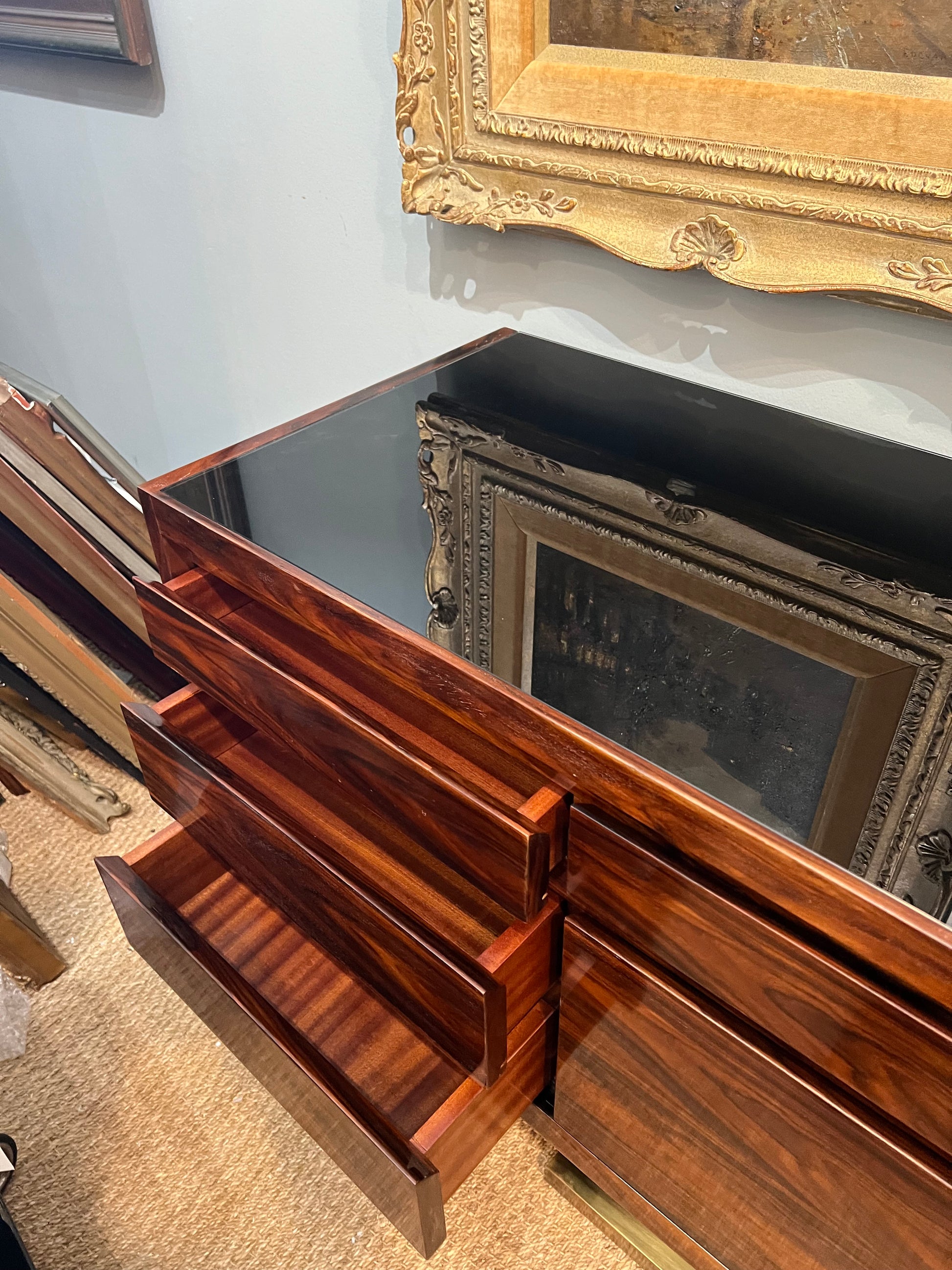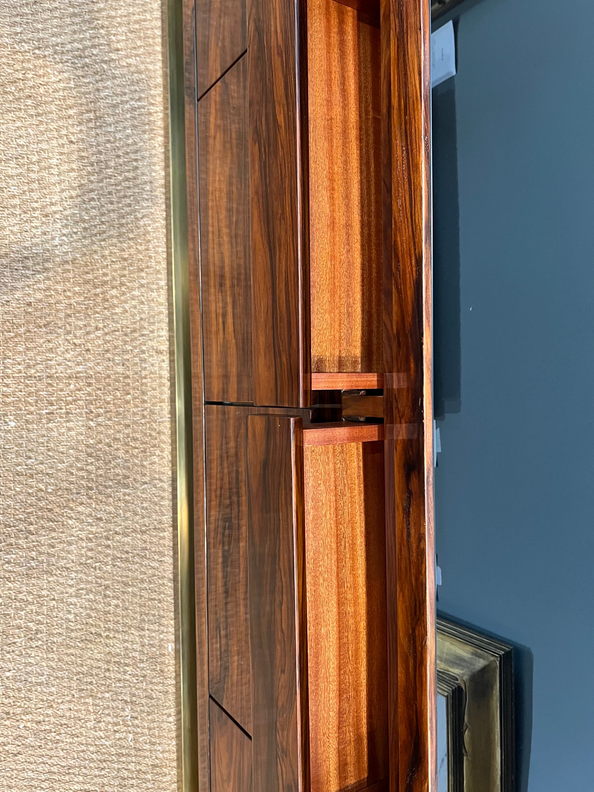 The sideboard is made out of beautiful walnut wood. It has several keyless shelves. The sideboard is resting on a brass rectangular base.