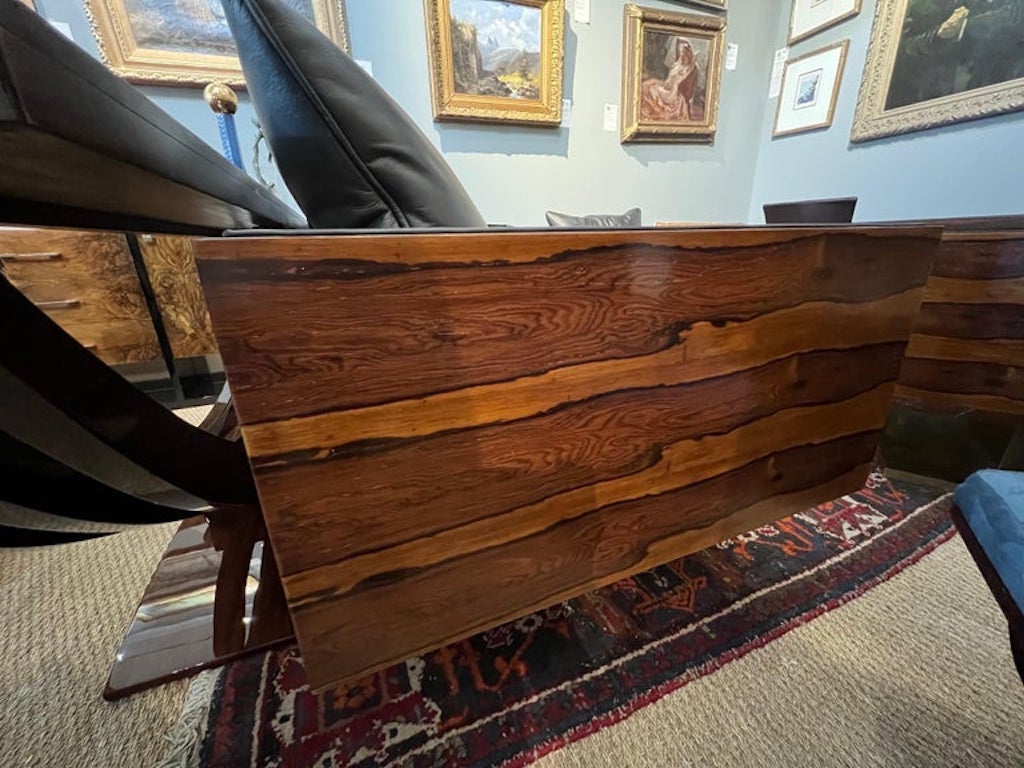 The sofa is made out of zebra wood. Upholstered with black cowhide.