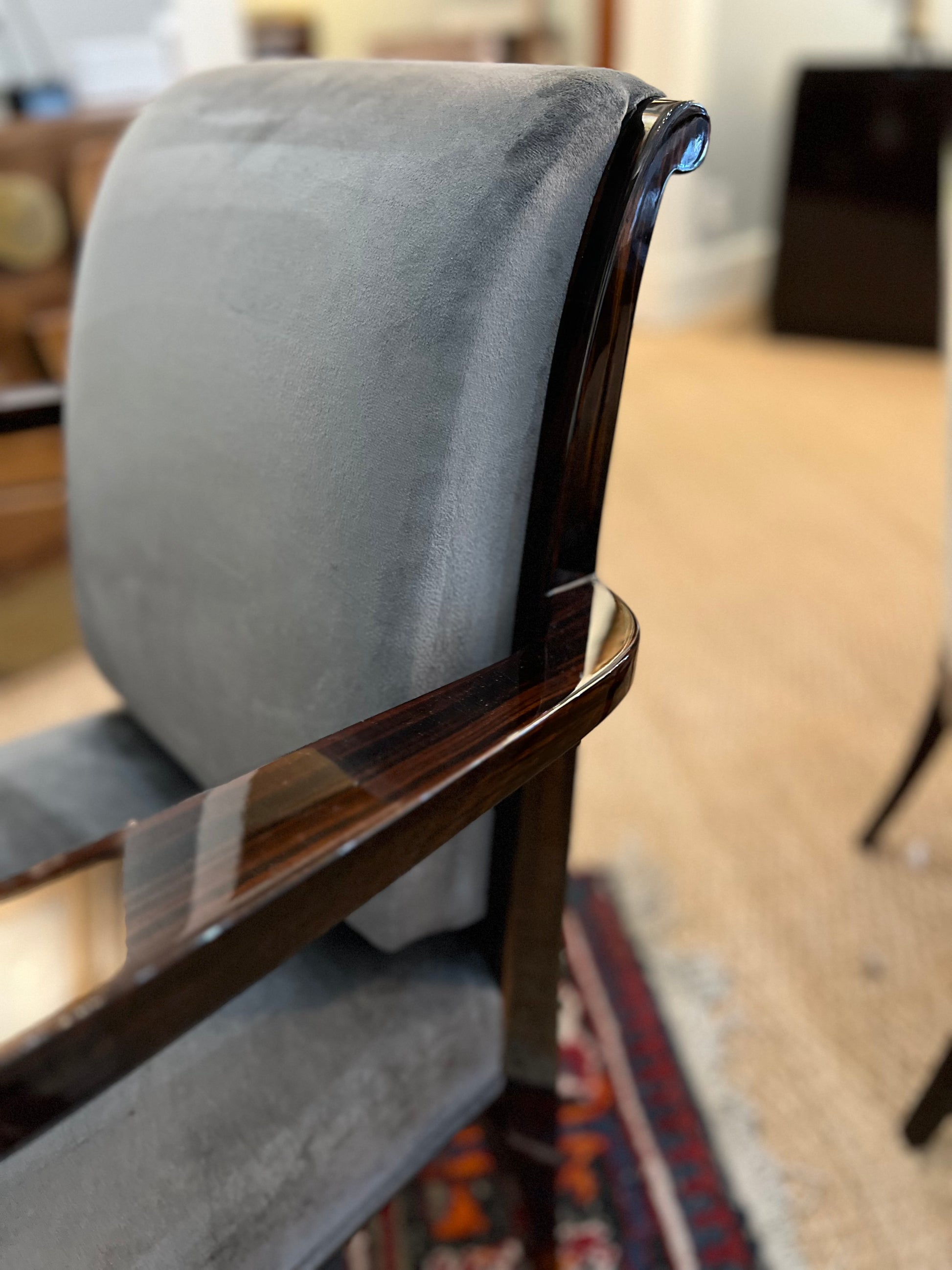 A set of 6 chairs is made out of beech tree wood and re-upholstered in a grey velvety fabric. There are 2 chairs with armrests and 4 without. It has a great back support and rests on 4 elongated wooden legs.